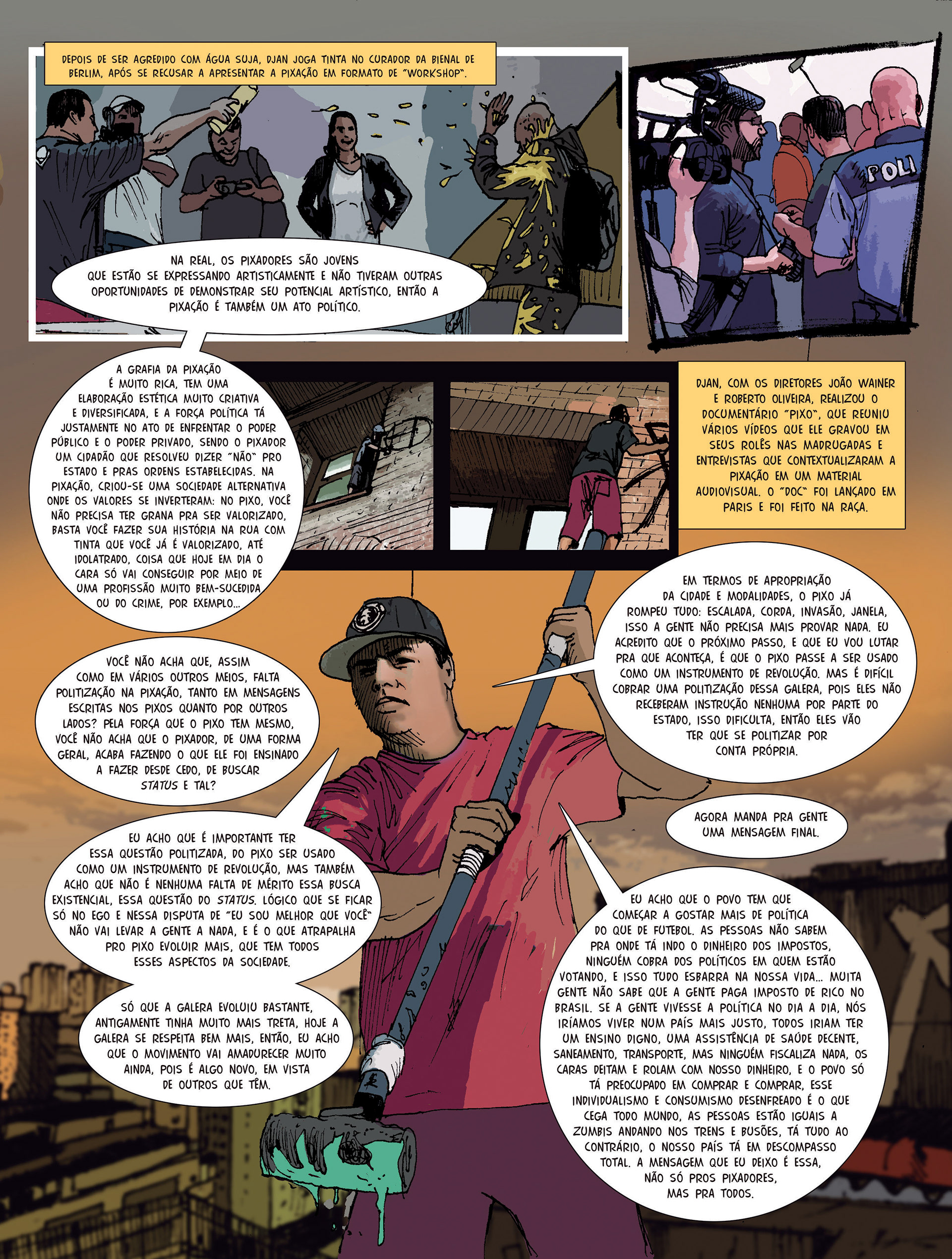 Une année d’entretiens sous forme de bande dessinée publiés chaque mois par la revue Fórum sur les taggueurs, l’identité indigène, les drogues, les policiers fugitifs, les manifestations...