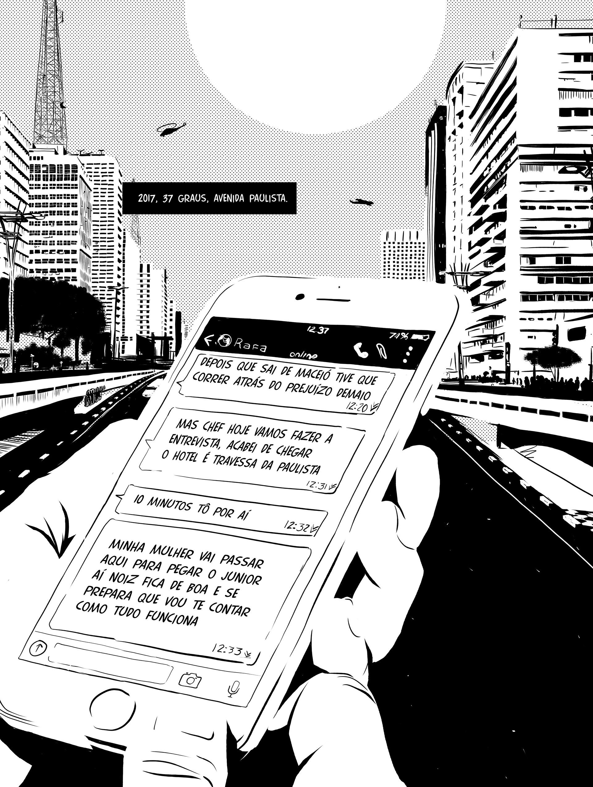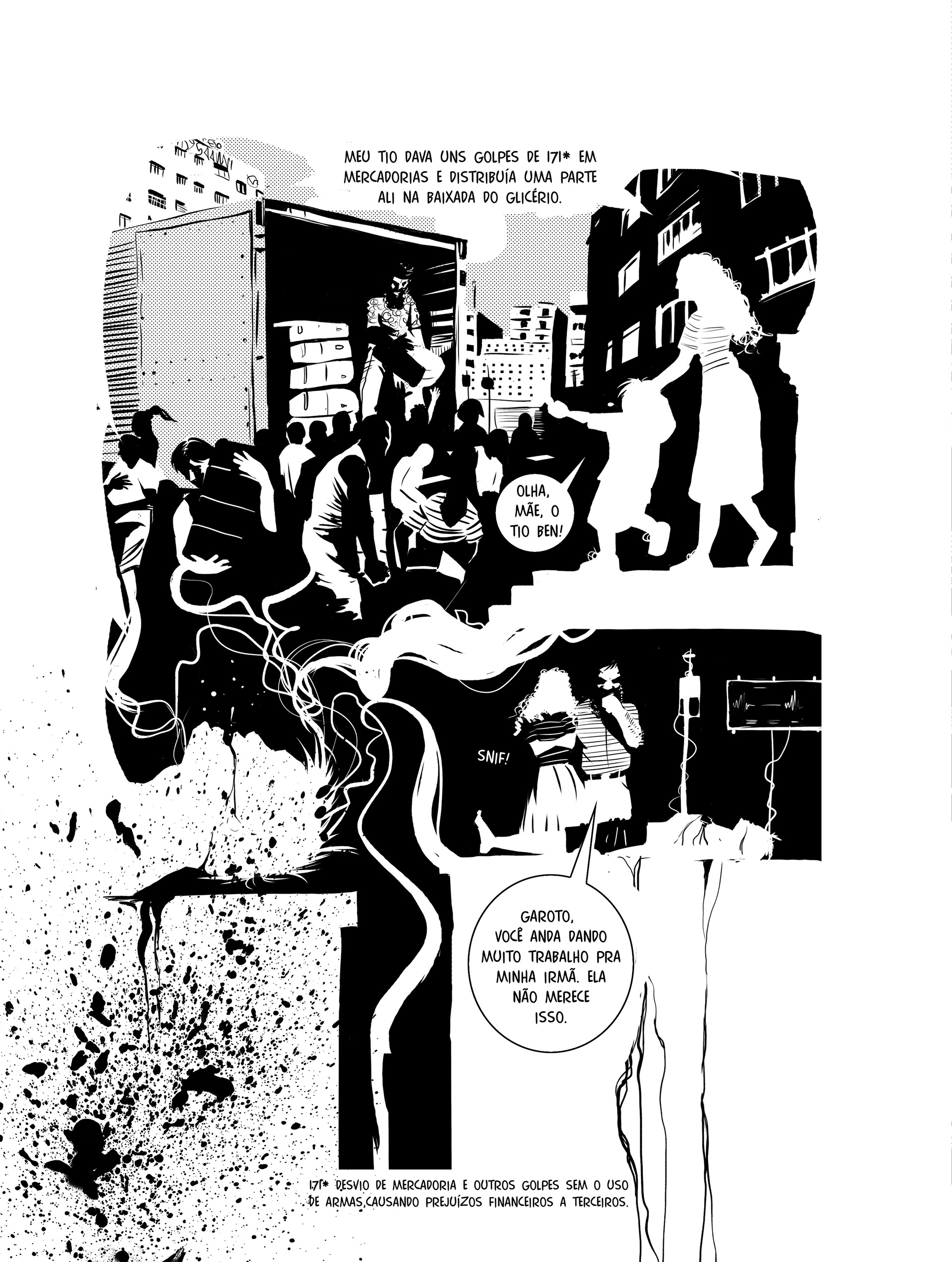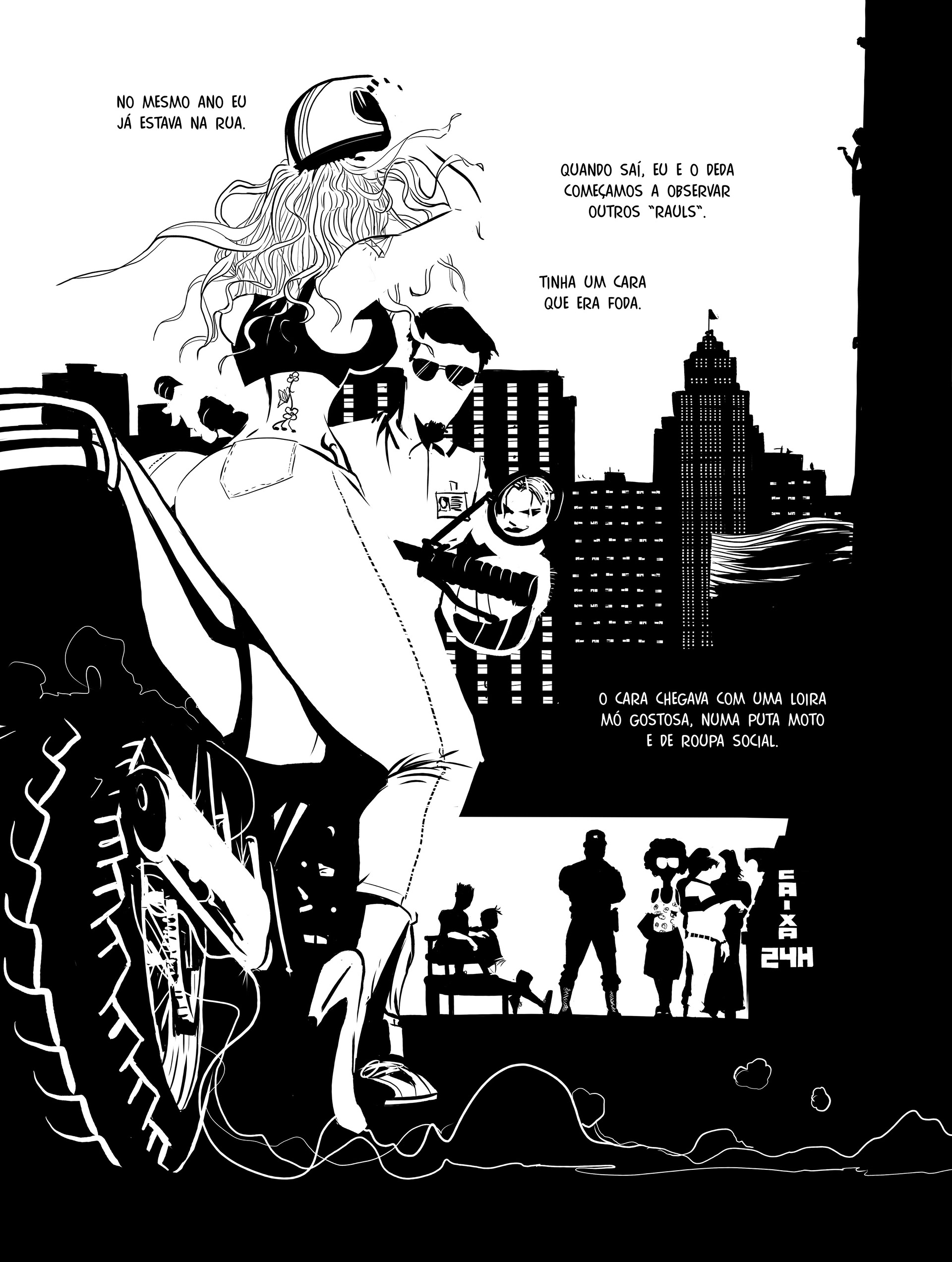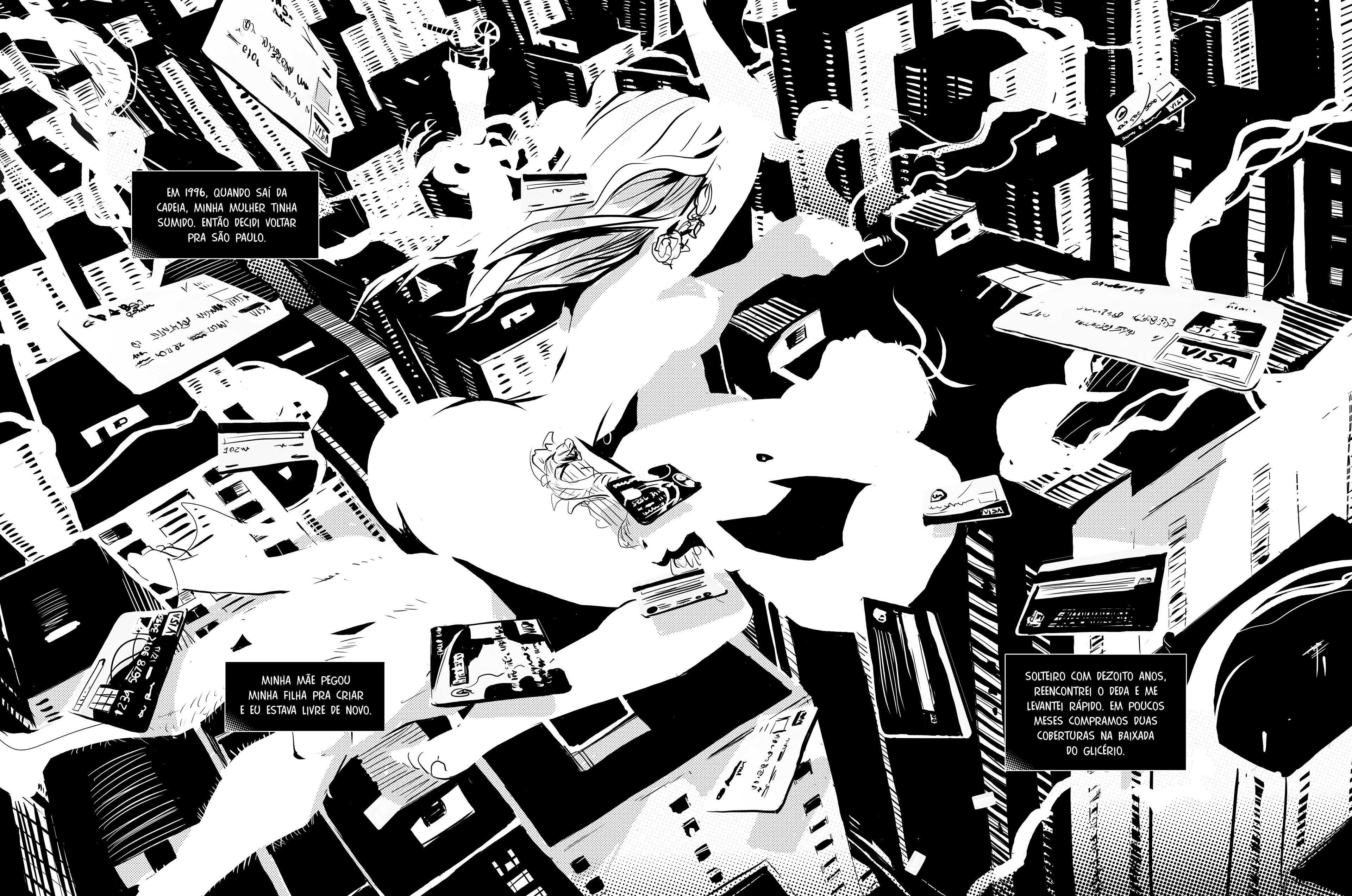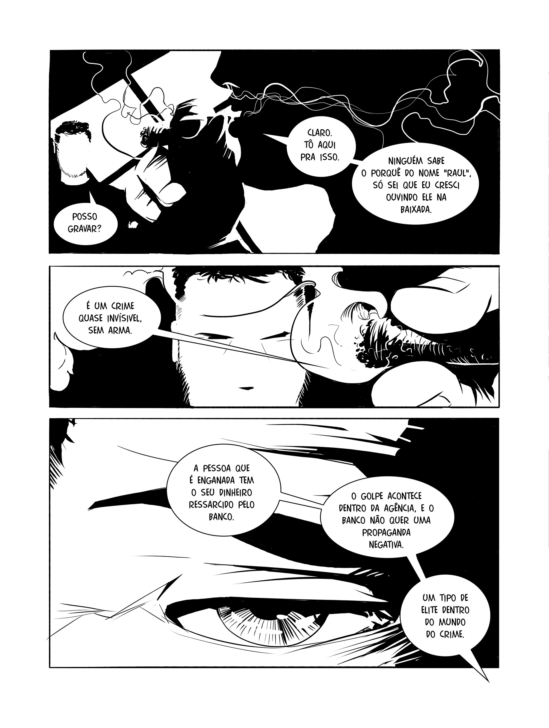 Rafa cresceu na Baixada Glicério, região central de São Paulo, e desde criança teve contato com o crime. Gostou do que viu nas ruas e becos do bairro, e abraçou a correria. Depois de cometer alguns assaltos e quase ser morto pela polícia, porém, resolveu correr menos riscos e ganhar mais dinheiro. Tornou-se, então, um “raul” — gíria da quebrada para se referir aos criminosos que aplicam golpes de cartão dentro das agências bancárias. Enquanto enganava clientes na fila do caixa eletrônico, aprimorando suas técnicas conforme os bancos reforçavam os mecanismos de segurança, Rafa acompanhou o surgimento de vários rappers e cantou cada novo hit internacional na frente da tevê, sem nunca perder a vontade de subir no palco. Um a um, Mc Hammer, 2Pac, Snoop Dogg e Dr. Dree estouraram nas paradas de sucesso; depois de ser preso várias vezes, casar e ter um filho, Rafa passou a cantar em rodas de samba. Então vieram as composições. Ao contrário de canções denunciando a realidade da periferia e a desigualdade social do país, tônica dos raps brasileiros até então, as letras de Rafa falavam de festas, mulheres, riqueza, sonhos, vida boa. Pegou gosto pelo microfone. Com a ajuda do amigo de um conhecido, Rafa gravou um disco. Surgiram oportunidades de se apresentar aqui e ali. E o criminoso foi pouco a pouco trocando os golpes bancários pela música. Quando já havia abandonado os cartões magnéticos, que naquele tempo ainda nem tinham chip, a estrela ascendente do rap nacional foi confrontada com alguns desafios da indústria fonográfica e do showbusiness. Então, tudo mudou. A partir de longas entrevistas com Rafa, que aqui aparece com nome fictício, Alexandre De Maio reconstrói a trajetória de um garoto humilde que escolheu viver a vida loka do crime sem jamais abandonar o sonho de ser famoso. Mas Raul não trata apenas da ascensão e queda de um artista. Ao longo da narrativa, ficamos conhecendo várias modalidades de golpes de cartão praticadas no país — um tipo de crime quase invisível — e sua evolução ao longo do tempo. Um livro-reportagem em quadrinhos como existem poucos no Brasil.